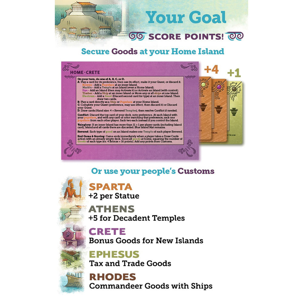– A unique deck of 44 island cards per player, each representing real locations around the Aegean Sea.