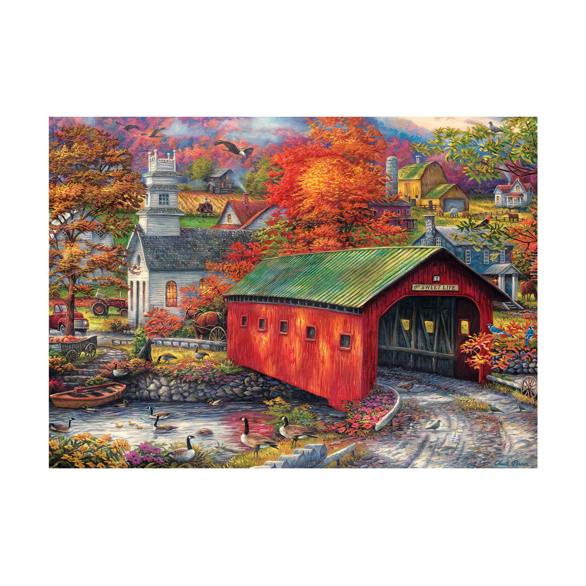 Piece together a picturesque autumn adventure with the Chuck Pinson Art Gallery – The Sweet Life: 1000 Pcs puzzle! As you fit each piece, unearth the rustic charm of small-town America depicted in stunning detail. This jigsaw adventure offers an enchanting mix of vibrant landscapes and nostalgic sceneries captured by the talented Chuck Pinson. Perfect for an afternoon of family fun or a quiet moment of relaxation, this eco-friendly puzzle is constructed with 100% recycled chipboard.