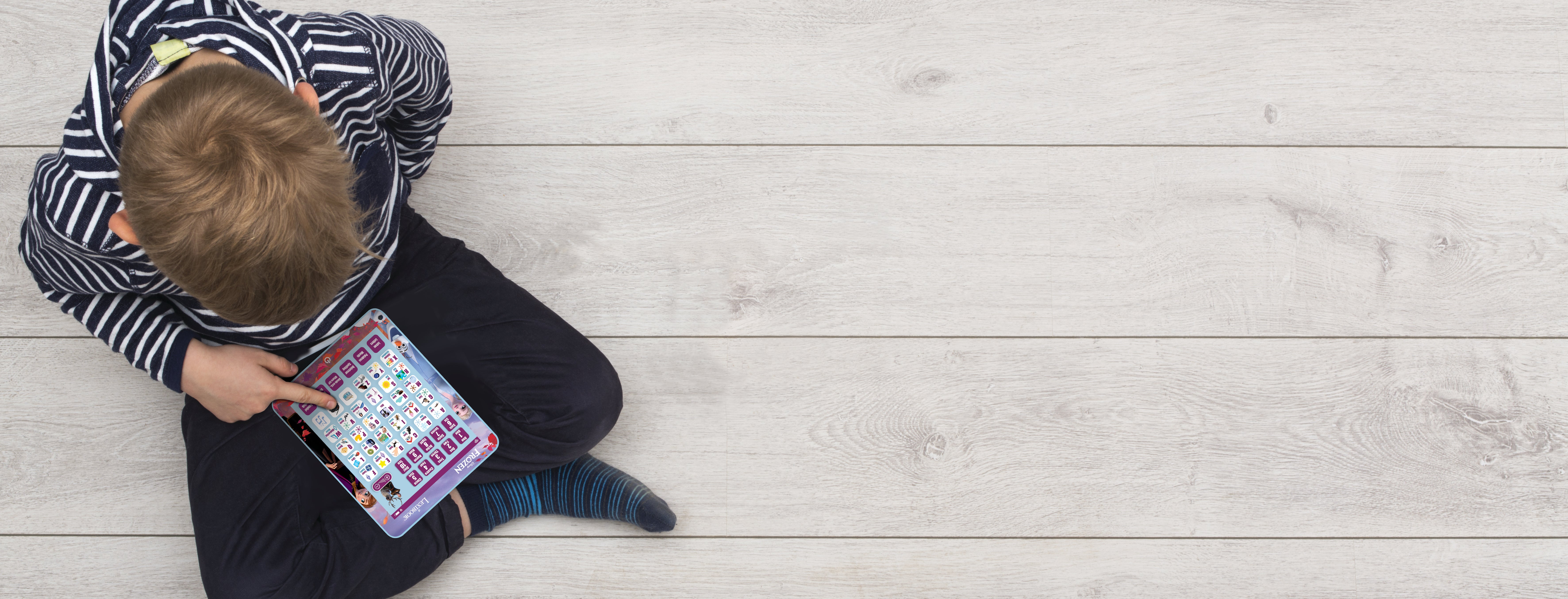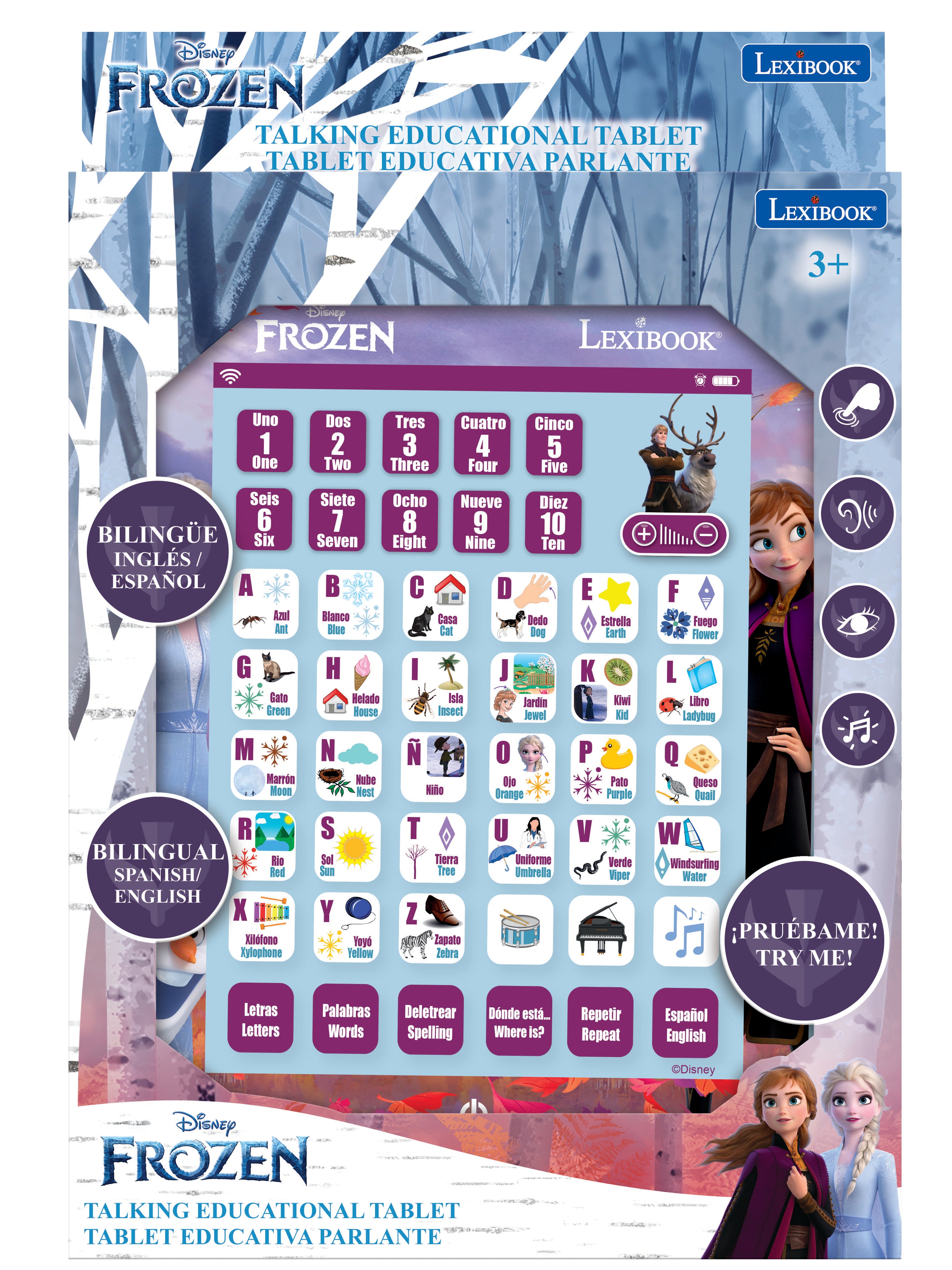 The Disney Frozen Bilingual Educational Tablet features: