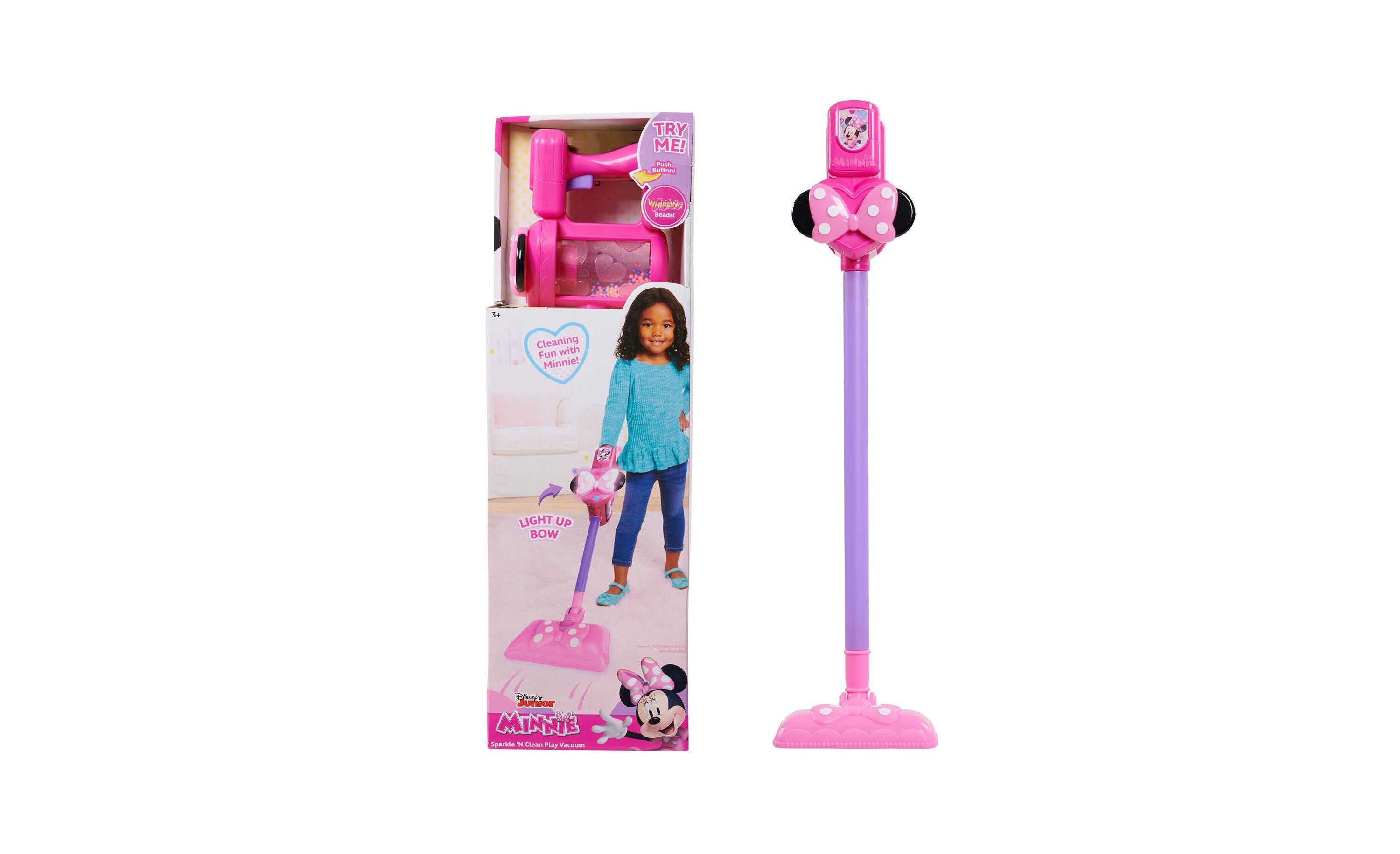 The Disney Junior Minnie Mouse Sparkle N’ Clean Play Vacuum features: