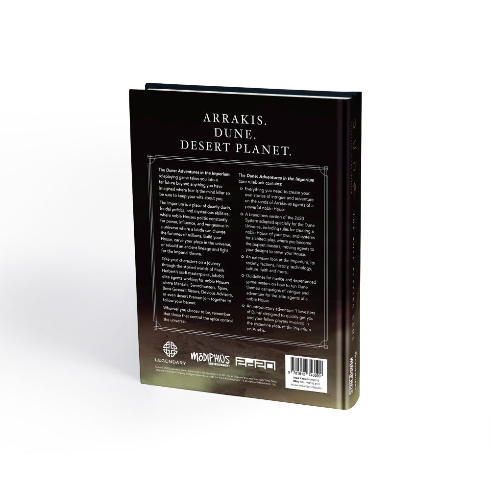 Buckle up your sand boots and crank up the spice‚Äîthey’re off to the mesmerizing and perilous sands of Arrakis with the Dune: Adventures in the Imperium RPG Core Rulebook! This immersive role-playing game allows players to navigate the complexities of feudal politics, deadly duels, and mysterious abilities. As you build your noble House and vie for power and influence, every decision can change the fortunes of millions. Join forces with characters like Mentats, Swordmasters, and Bene Gesserit Sisters, and strategize to control the all-important spice to dominate the universe. Crafted with detailed artwork and rich narrative, this core rulebook is your gateway to adventure on the desert planet of Arrakis.