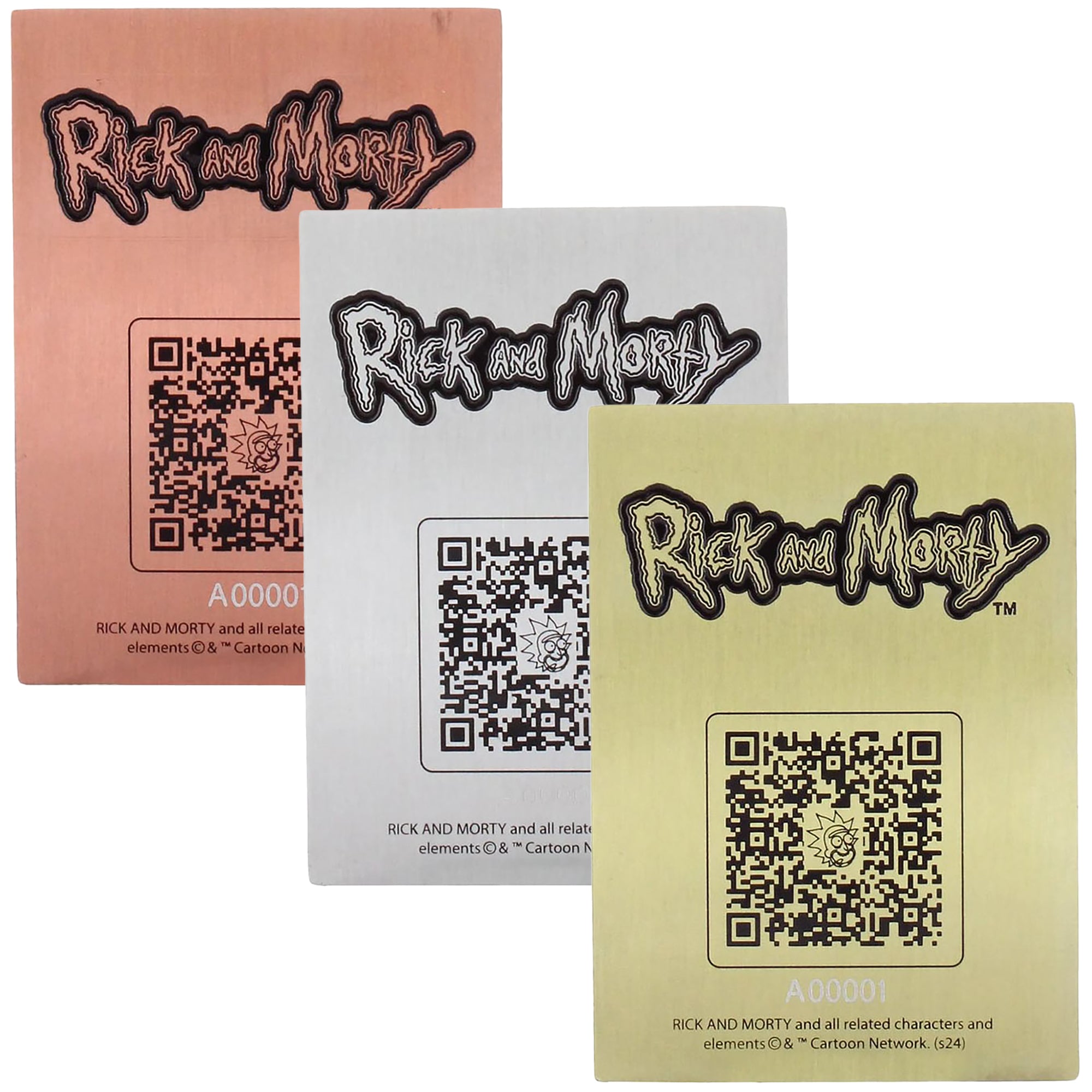 Three themed collectible metal cards with Rick & Morty artwork