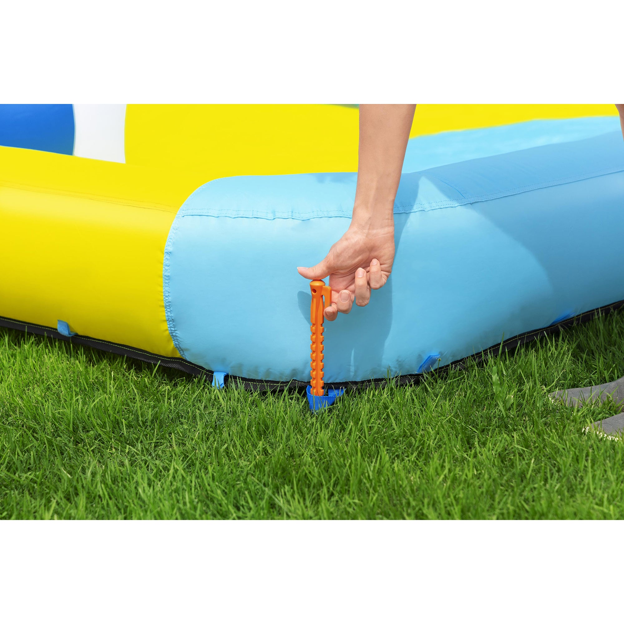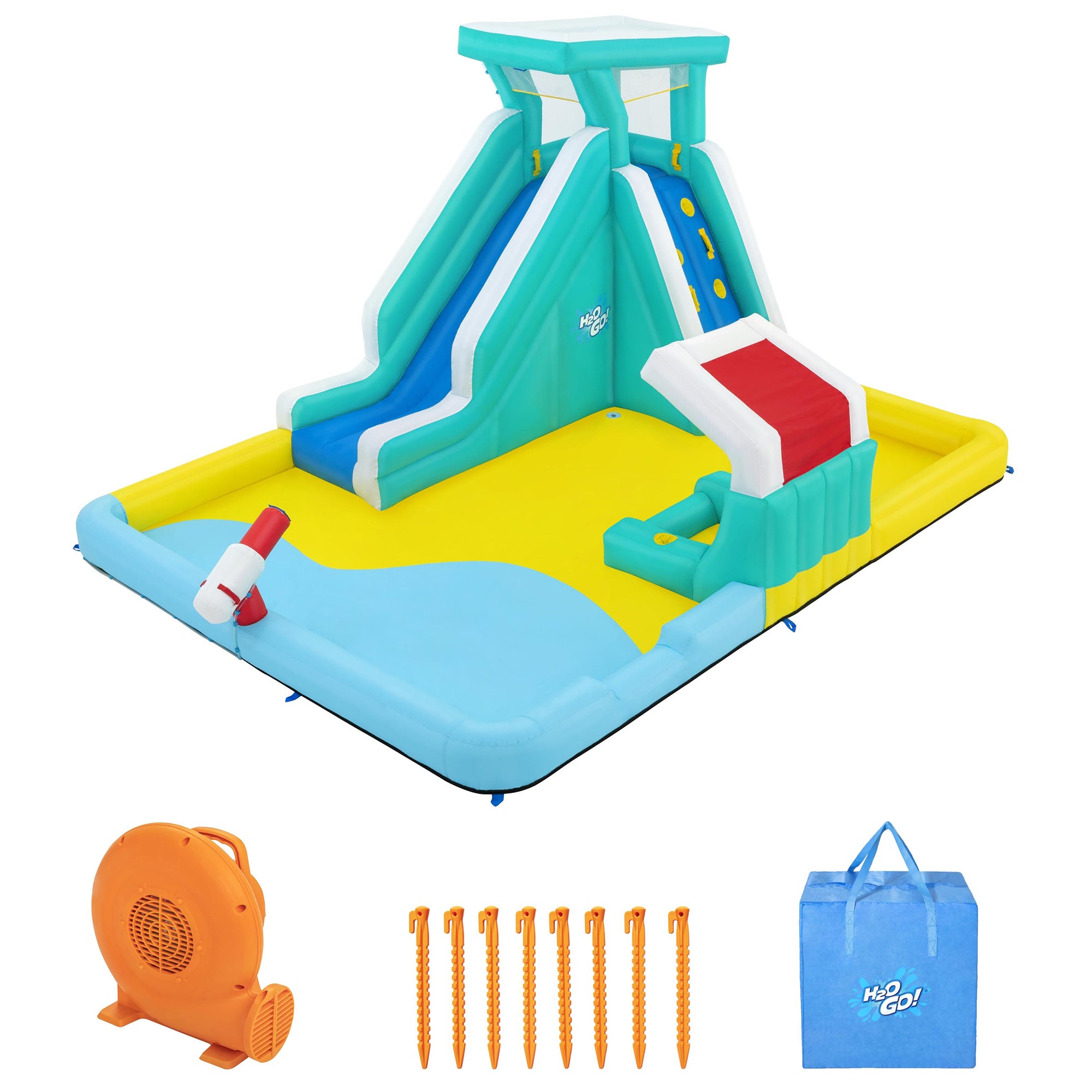 Splash into summer with the H2OGO! Mega Water Park – Beach Blast, your backyard solution to beat the heat and boredom! This mega, inflatable water park measures an impressive 14’9″ x 11’2″ x 8’3″ and brings the beach vibes right to your lawn. Equip your little adventurers with endless fun as they climb up the padded wall, whizz down the slick water slide, and engage in water blaster battles. Plus, no need to worry about sunburns-the shaded canopy keeps everyone cool and protected. Set up is a breeze too; with the included heavy-duty blower, get ready to make waves in just 2 minutes!