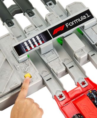 The Hot Wheels Race Formula 1 Grand Prix Circuit Track Set and Cars features: