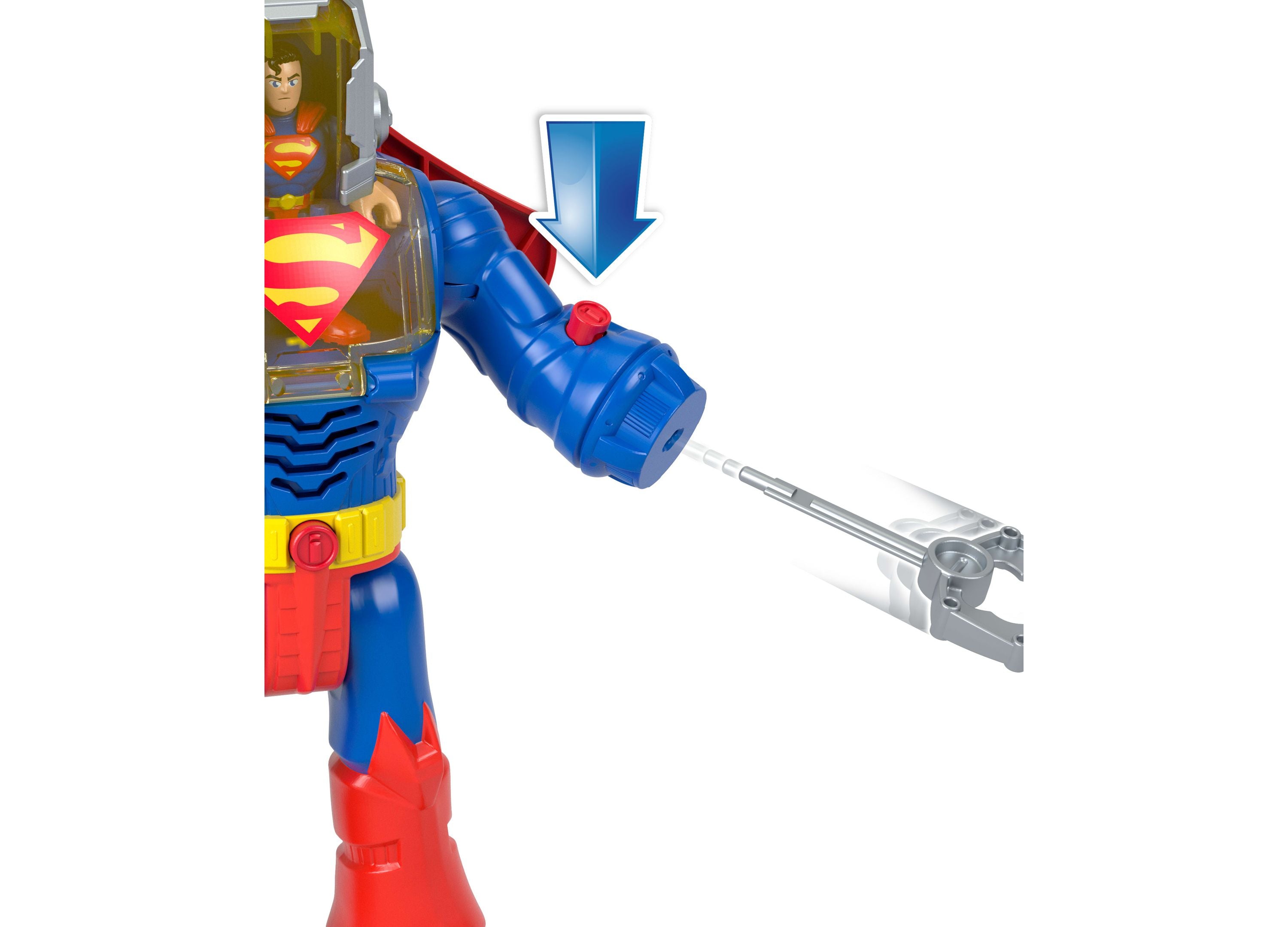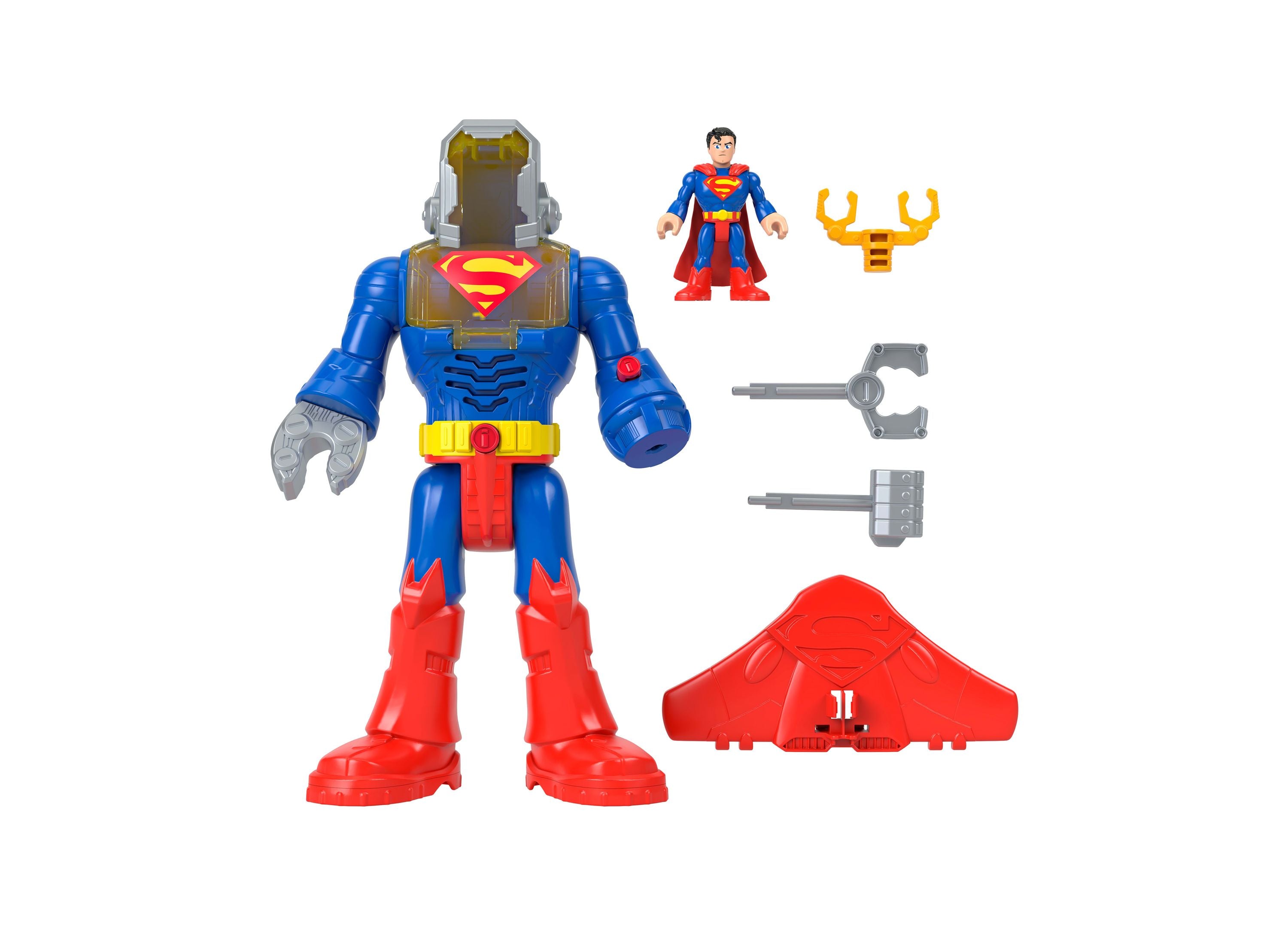 The Imaginext DC Super Friends Superman Insider Exo Suit Robot features: