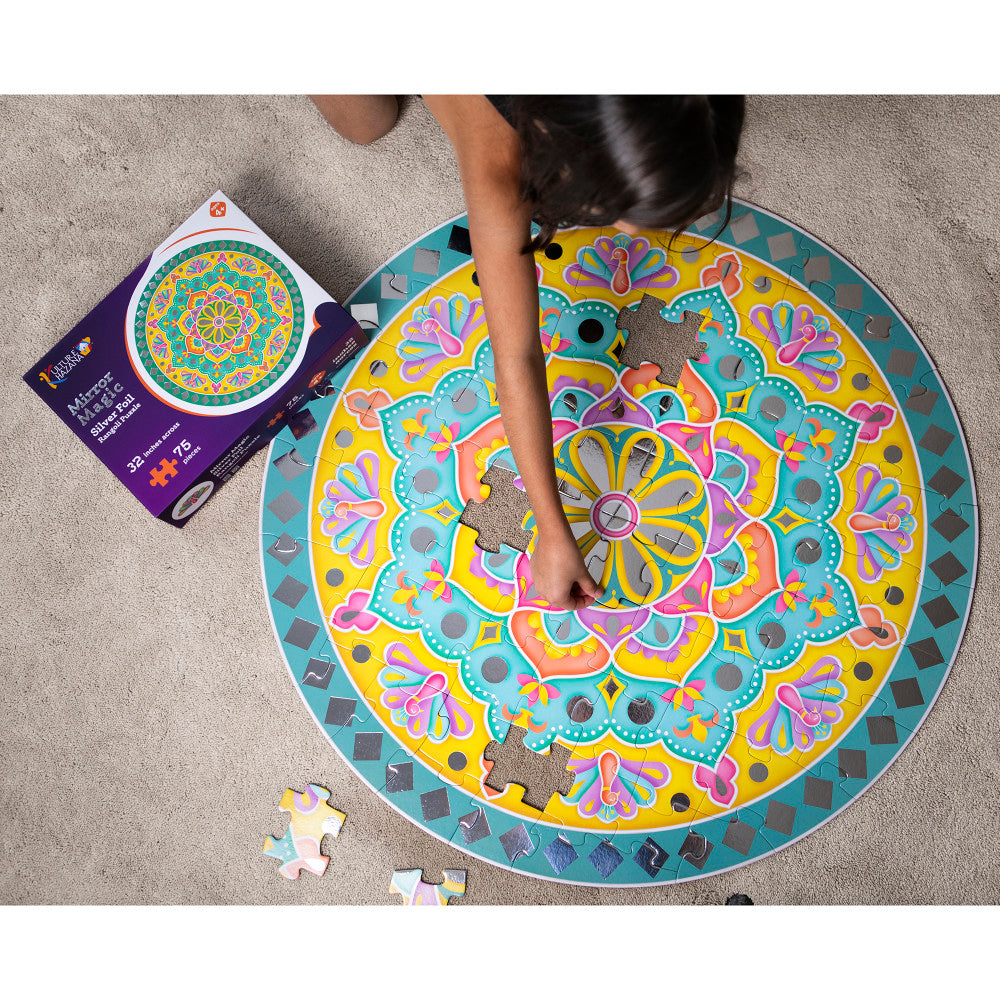 Step into a shimmering world of color and culture with the Kulture Khazana: Mirror Magic – 75pc Floor Puzzle, Kids Ages 4+! This mesmerizing 32-inch circular puzzle brings the brilliance of traditional Indian Lippan art right to your floor. The shiny, reflective silver foil pieces dazzle the eye, making every puzzle session a vibrant festival of hues.
