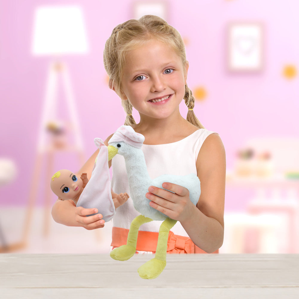 Magic Nursery 8-inch Special Delivery Set – Posable Newborn Baby Doll with Plush Stork, Pink