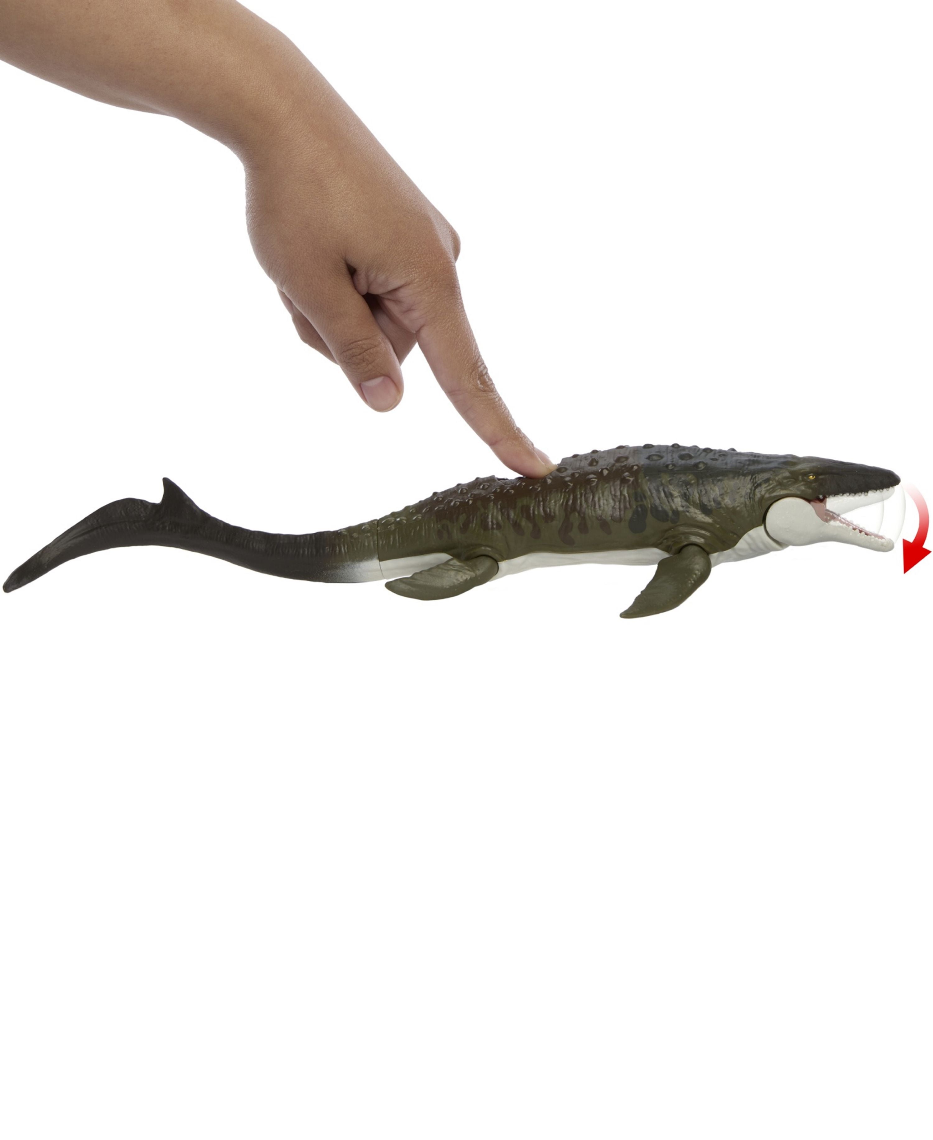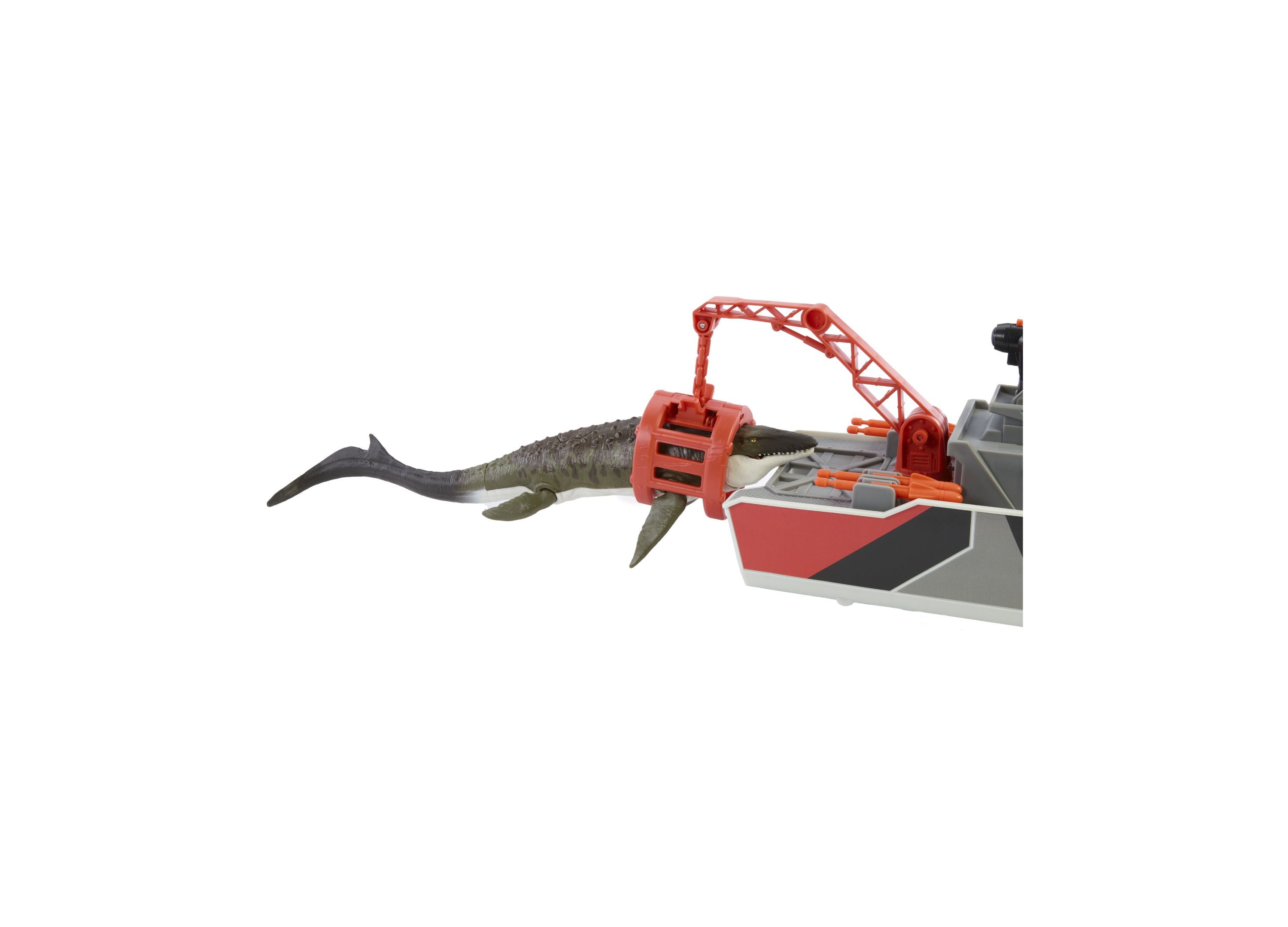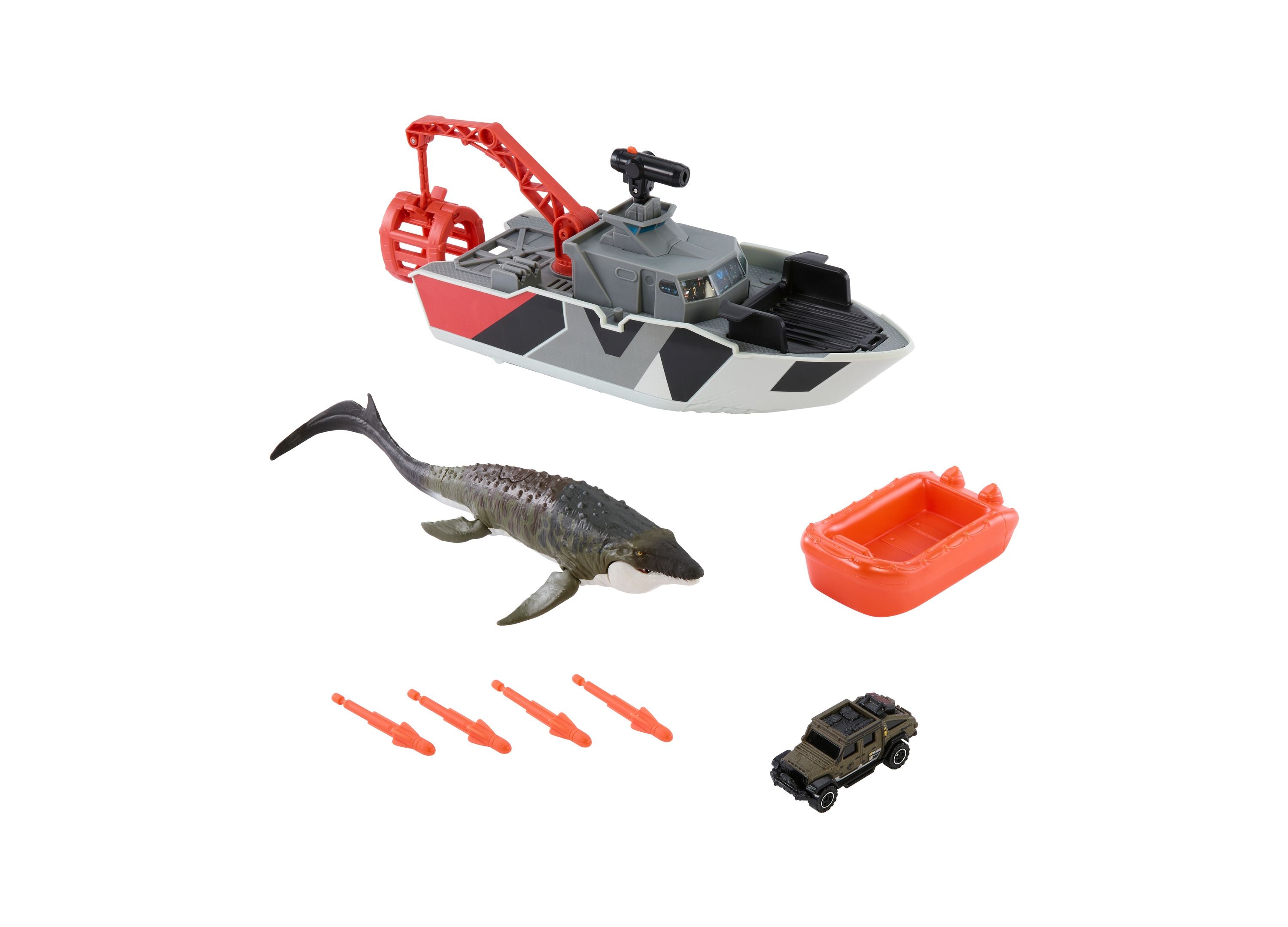 The Matchbox Jurassic World Mosasaurus Rescue Action Boat Playset features: