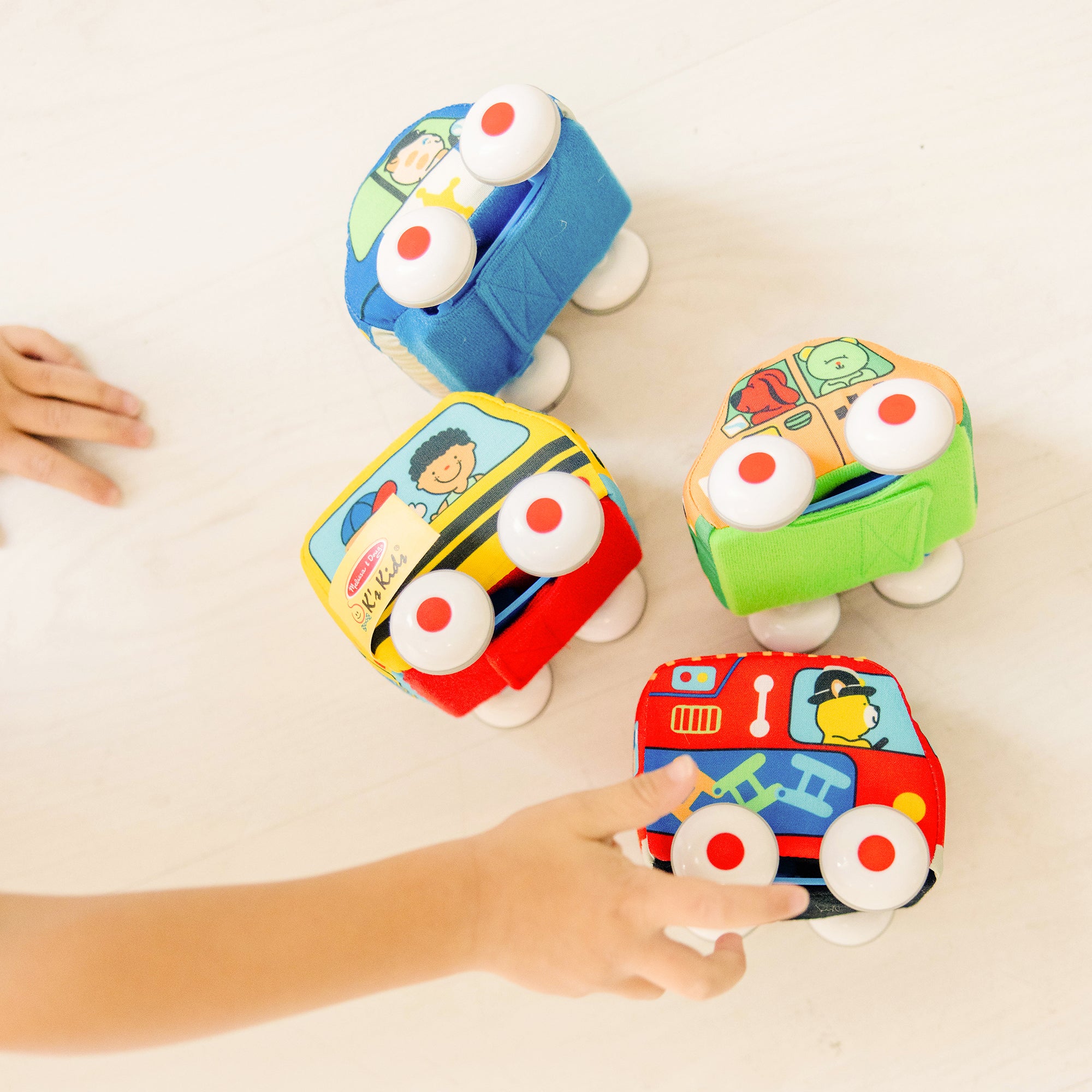 – Four colorful soft vehicles: school bus, family car, fire truck, and police car