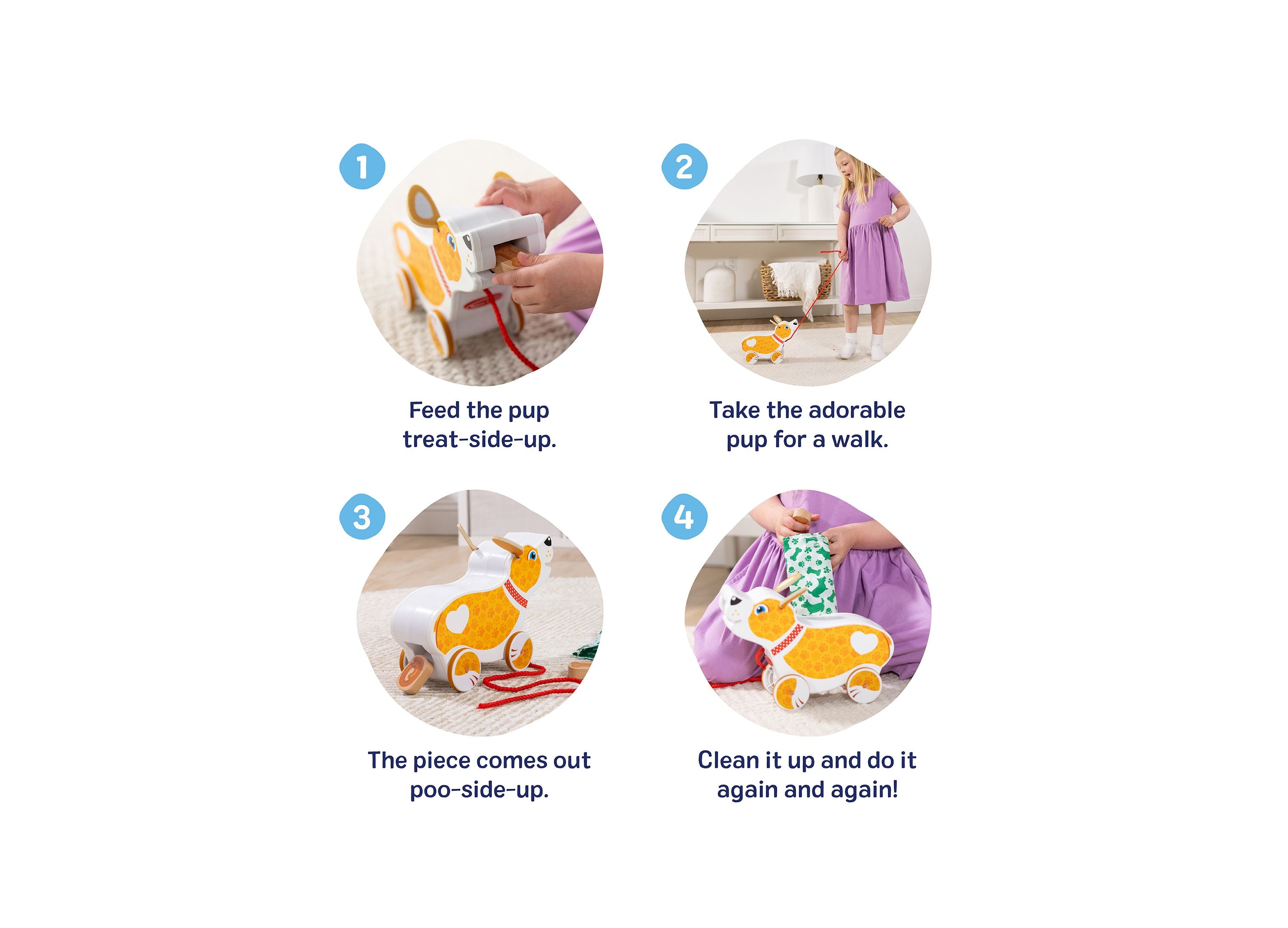 Food goes in, poo comes out Feed the adorable pup treat-side-up, take it for a walk, and the piece comes out poo-side-up; clean up and do it again and again. Includes wooden puppy pull-toy with attached leash and wheels, 3 wooden double-sided treats or poos, reversible bag for treat storage and poo cleanup. Create giggles galore. Pop one of the pieces treat-side-up into the pup’s mouth and, after pulling the toy approximately 8 feet (2.4 meters), the treat comes out the other end poo-side-up. A fun and engaging way for kids learning to walk to practice important developmental skills: movement, hand-eye coordination, storytelling, and counting; demonstrate cause-and-effect and build confidence and self-esteem. Makes a great gift for babies, toddlers, and preschoolers, ages 18 months to 4, for hands-on, screen-free play and early learning.
