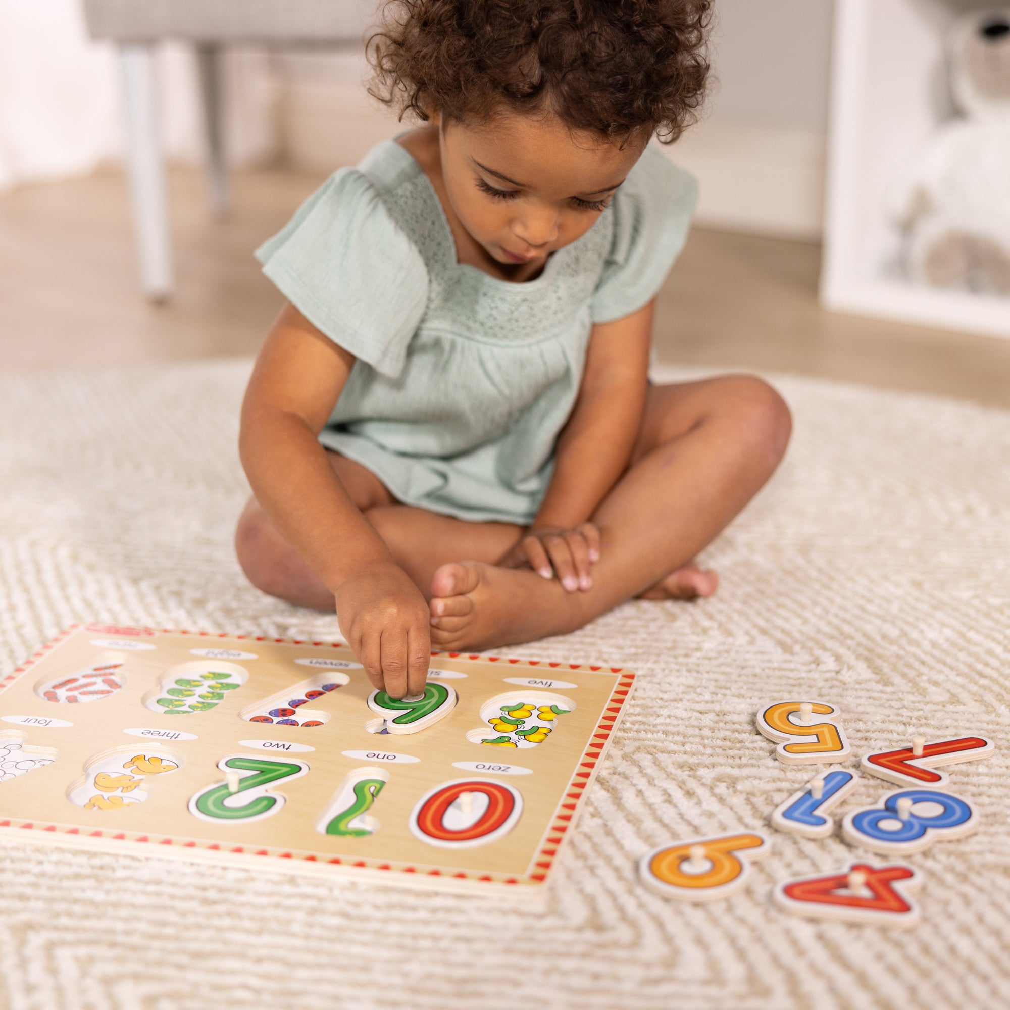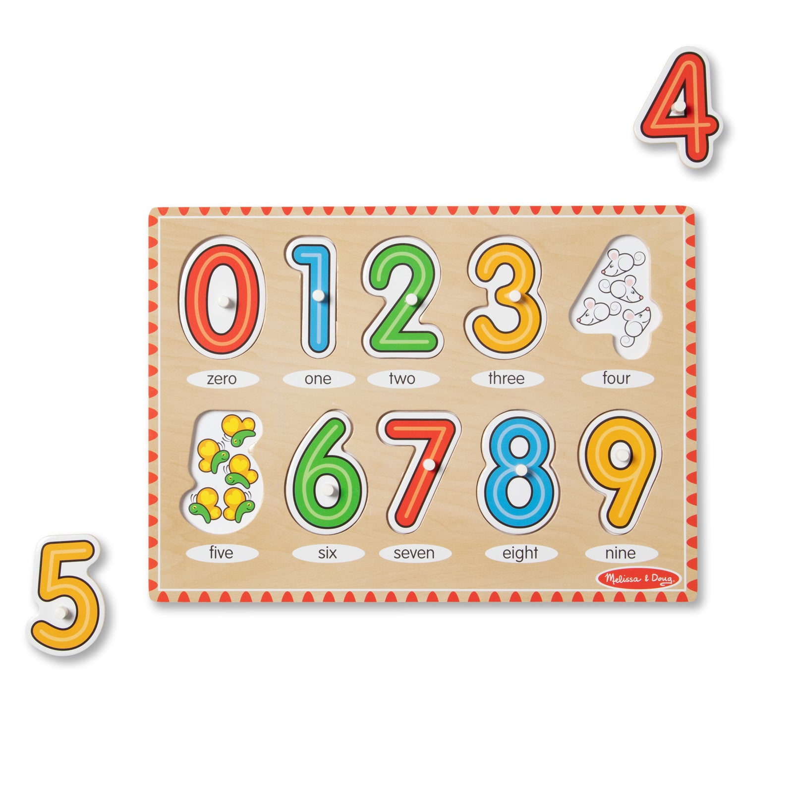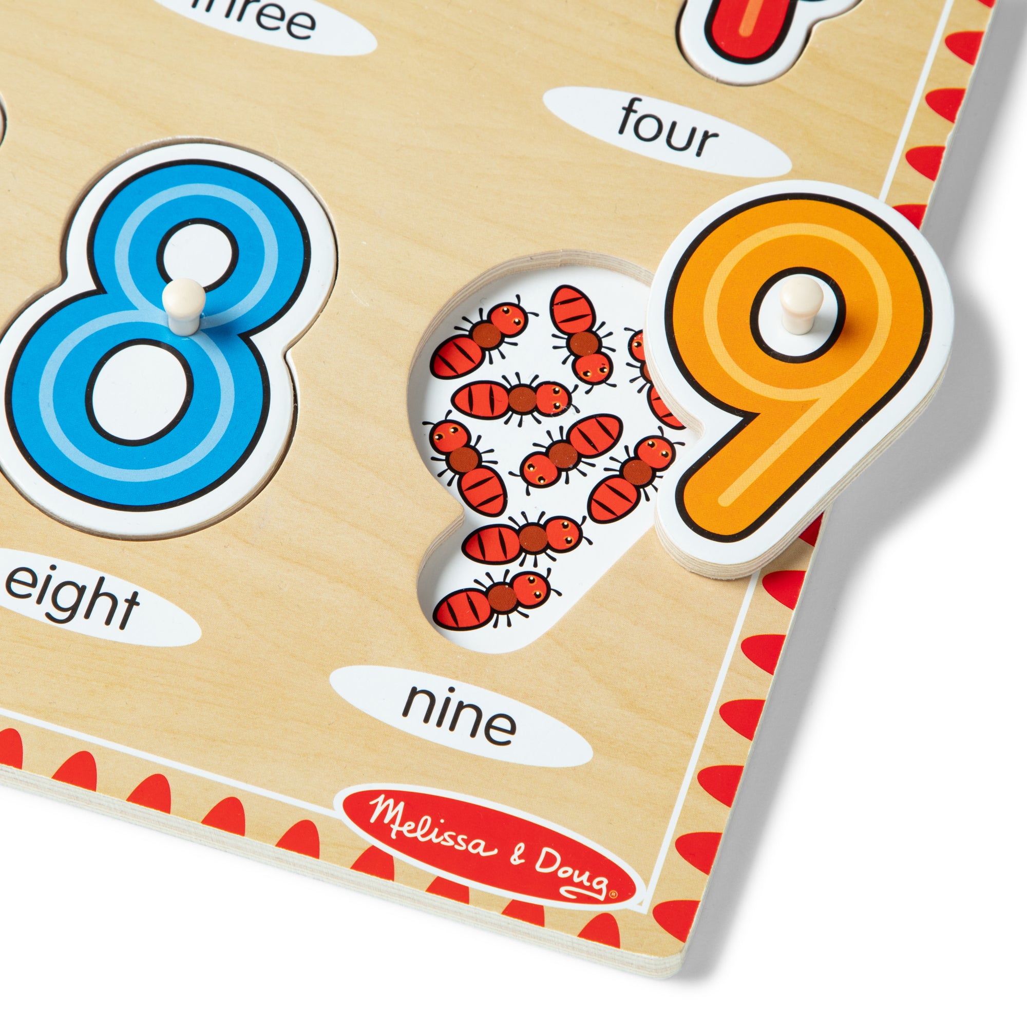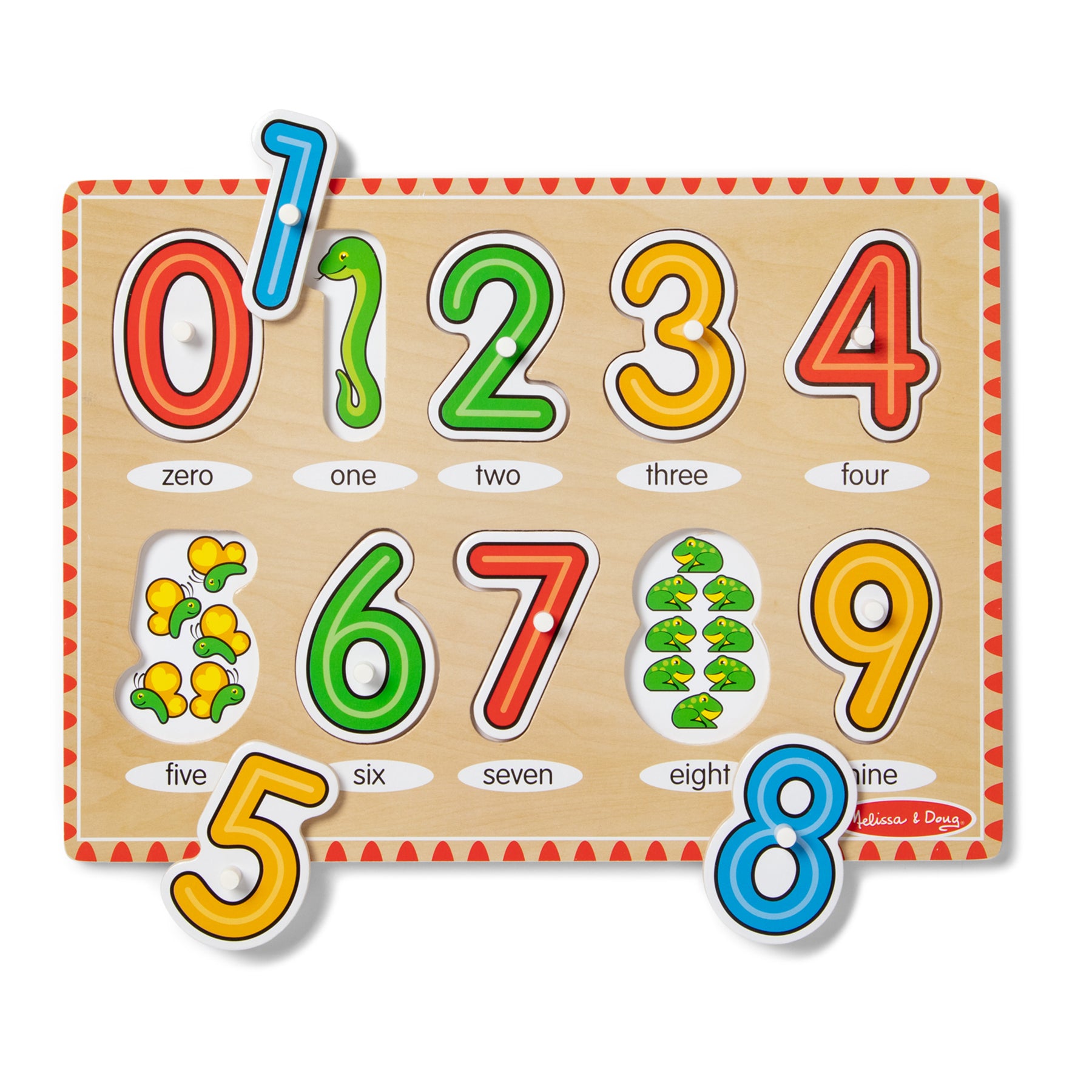 The Melissa & Doug See-Inside Numbers Peg Puzzle features: