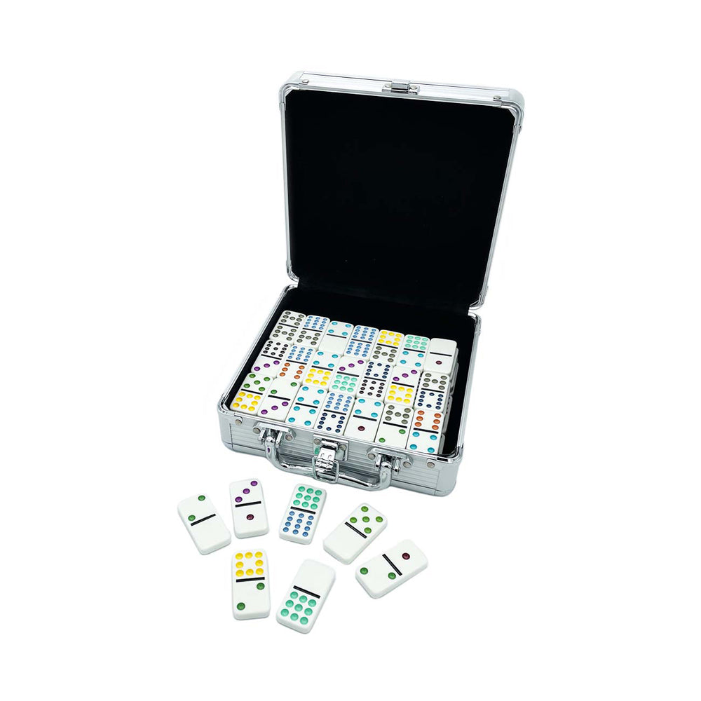 – High-quality, large-sized dominoes with brightly colored dots