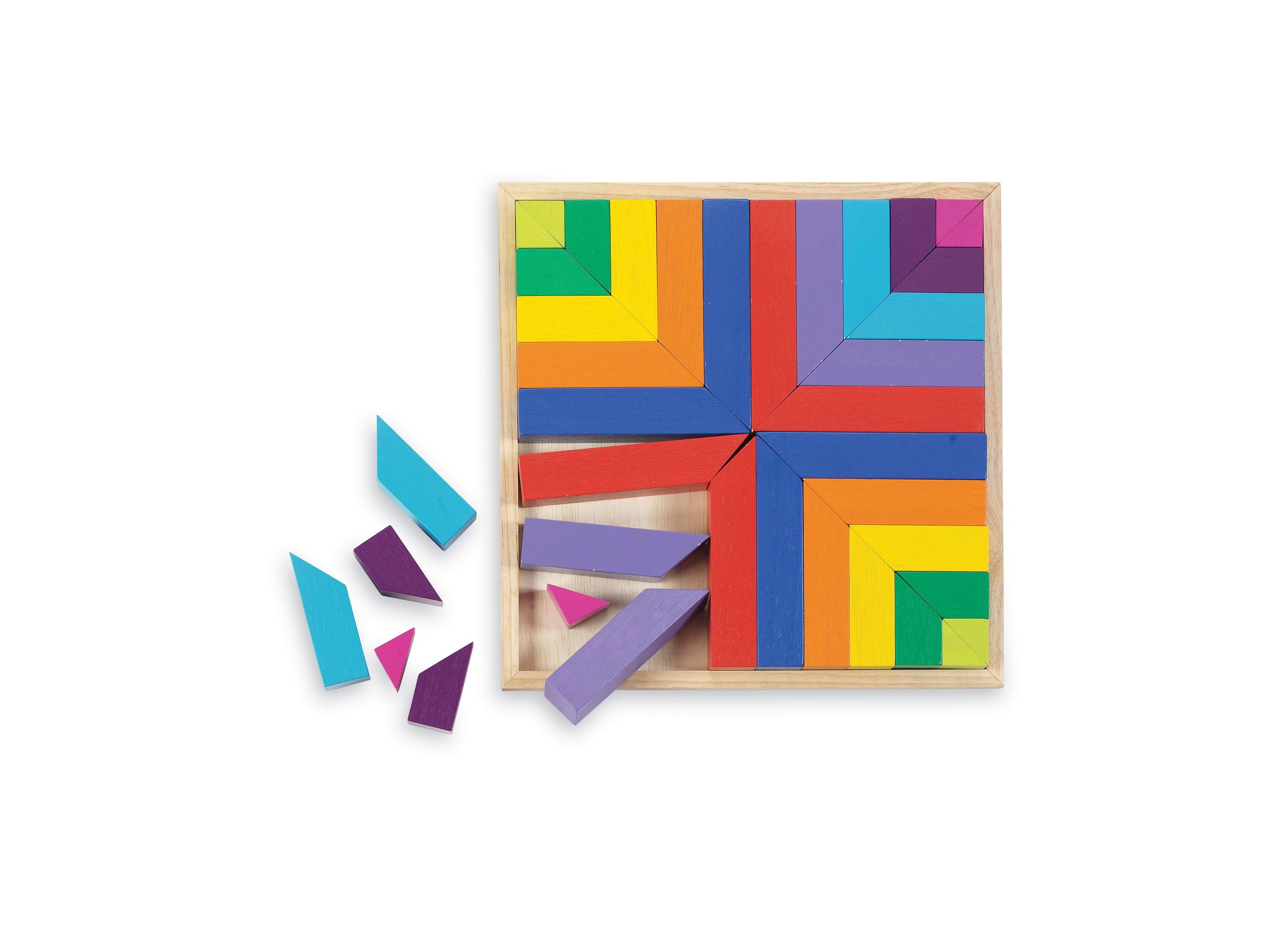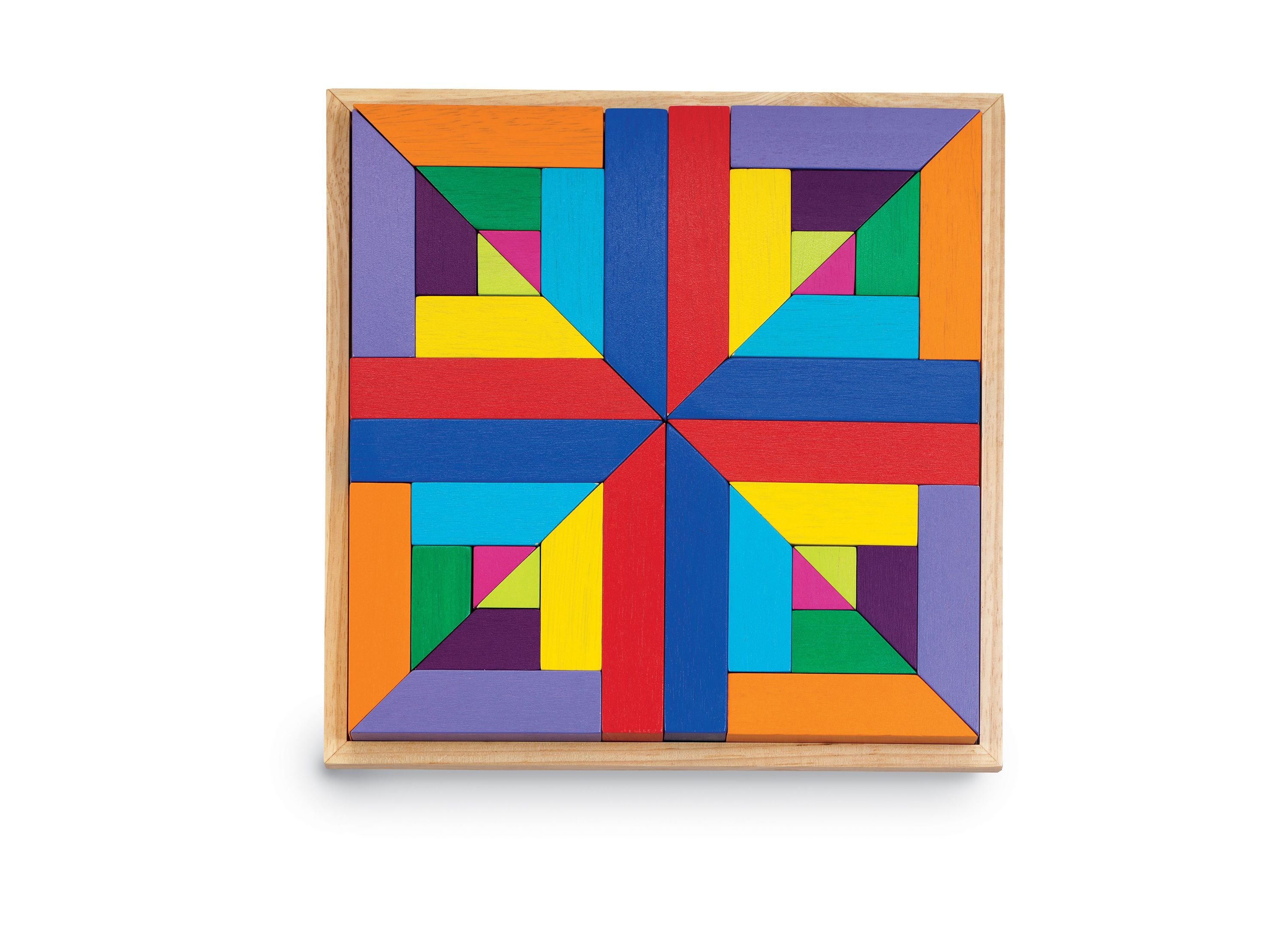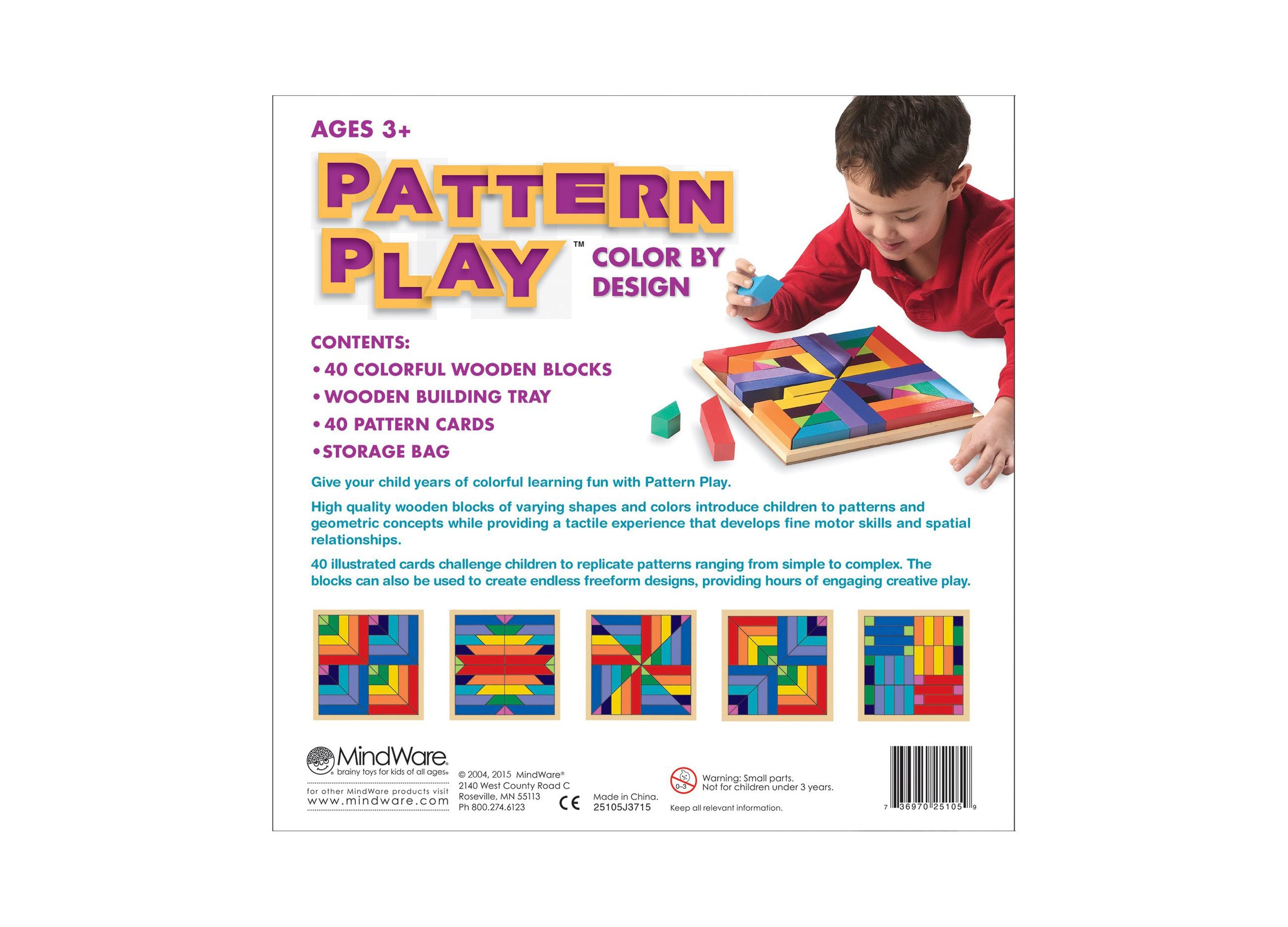 The MindWare Pattern Play Colorful Wooden Blocks and Tray Set features: