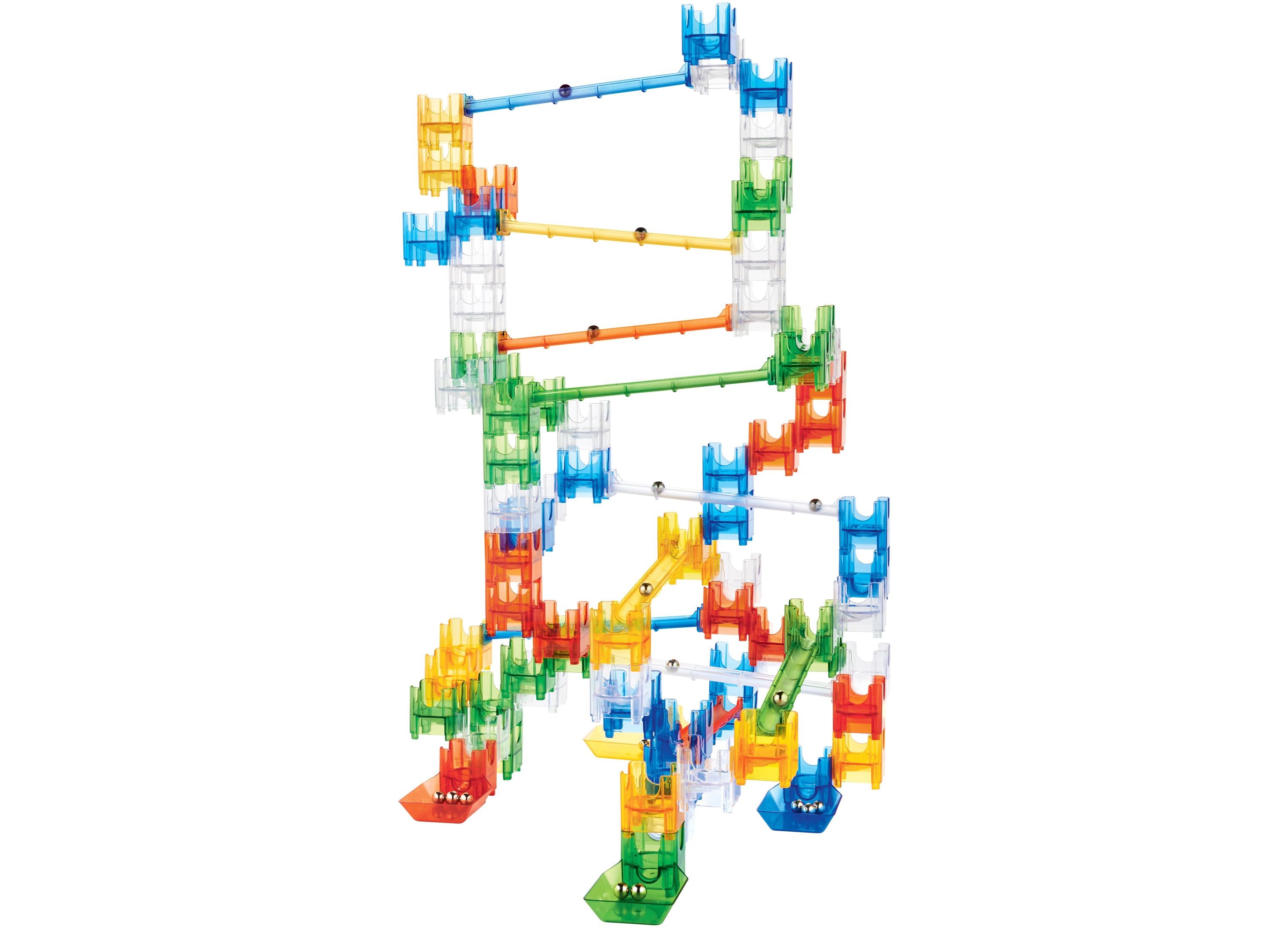 – Includes 20 marbles and 4 exclusive light-up cubes that flash as marbles pass through.