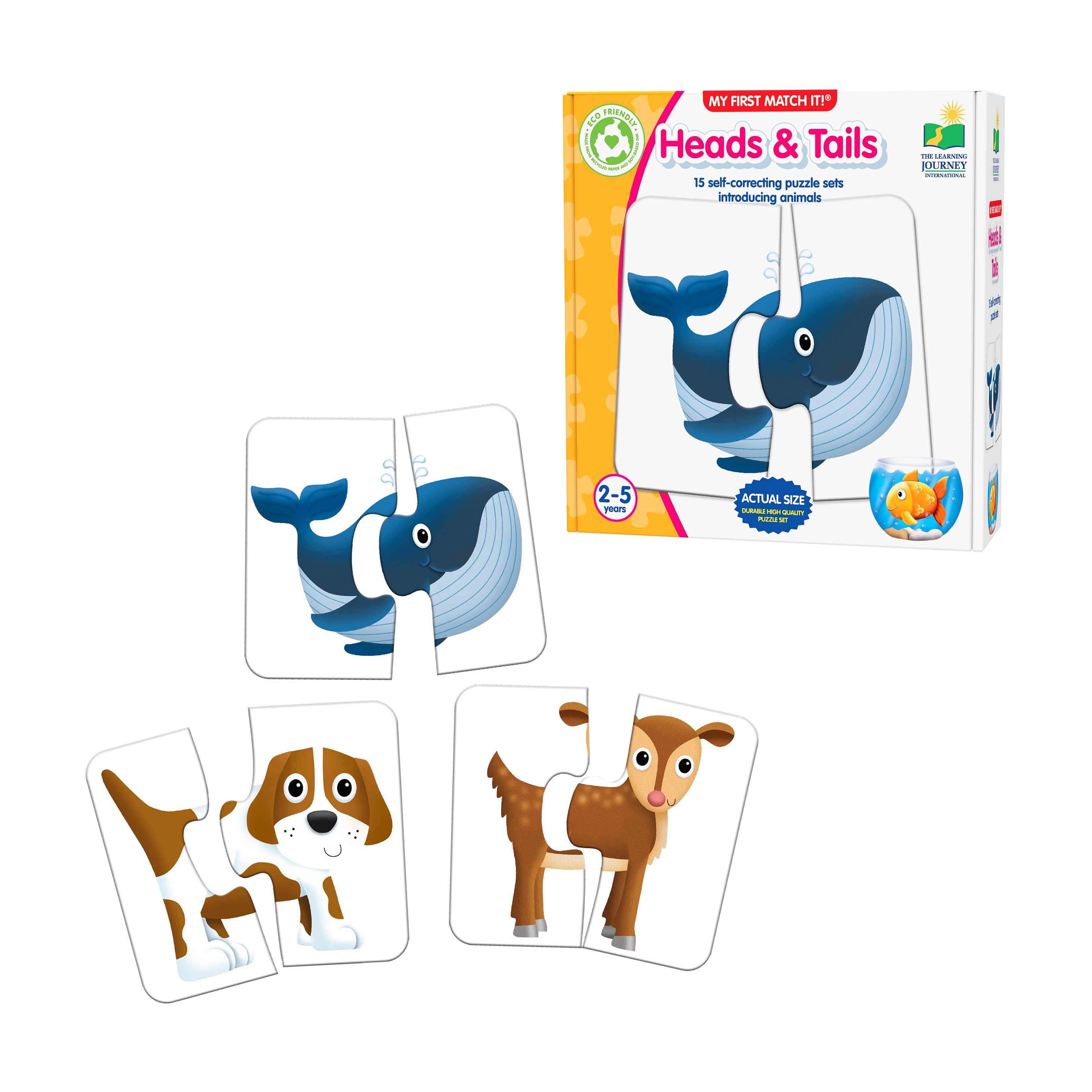 Whimsy meets learning with My First Match It! – Heads & Tails! This enchanting set charms children ages 2-5 with a delightful introduction to animals. With 15 vibrant puzzle cards totaling 30 pieces, each showcasing an adorable animal’s head and tail, little learners can piece together their favorite creatures! These puzzles, unique in each cut, magically guide themselves to the correct solution – boosting both confidence and cognitive skills.