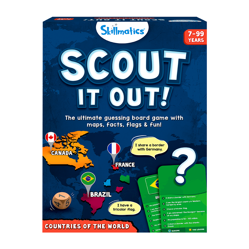 Buckle up and embark on a cross-country adventure with the Scout it Out ‚Äì The 50 States board game! This engaging and educational game is perfect for family game nights, road trips, and outdoor picnics. Players roll the die and use clues to guess the states, learning fascinating facts about each one along the way. It’s easy to learn, fun to play, and a great way to enhance your knowledge of U.S. geography and history. Be the first to correctly identify five states and win the game!
