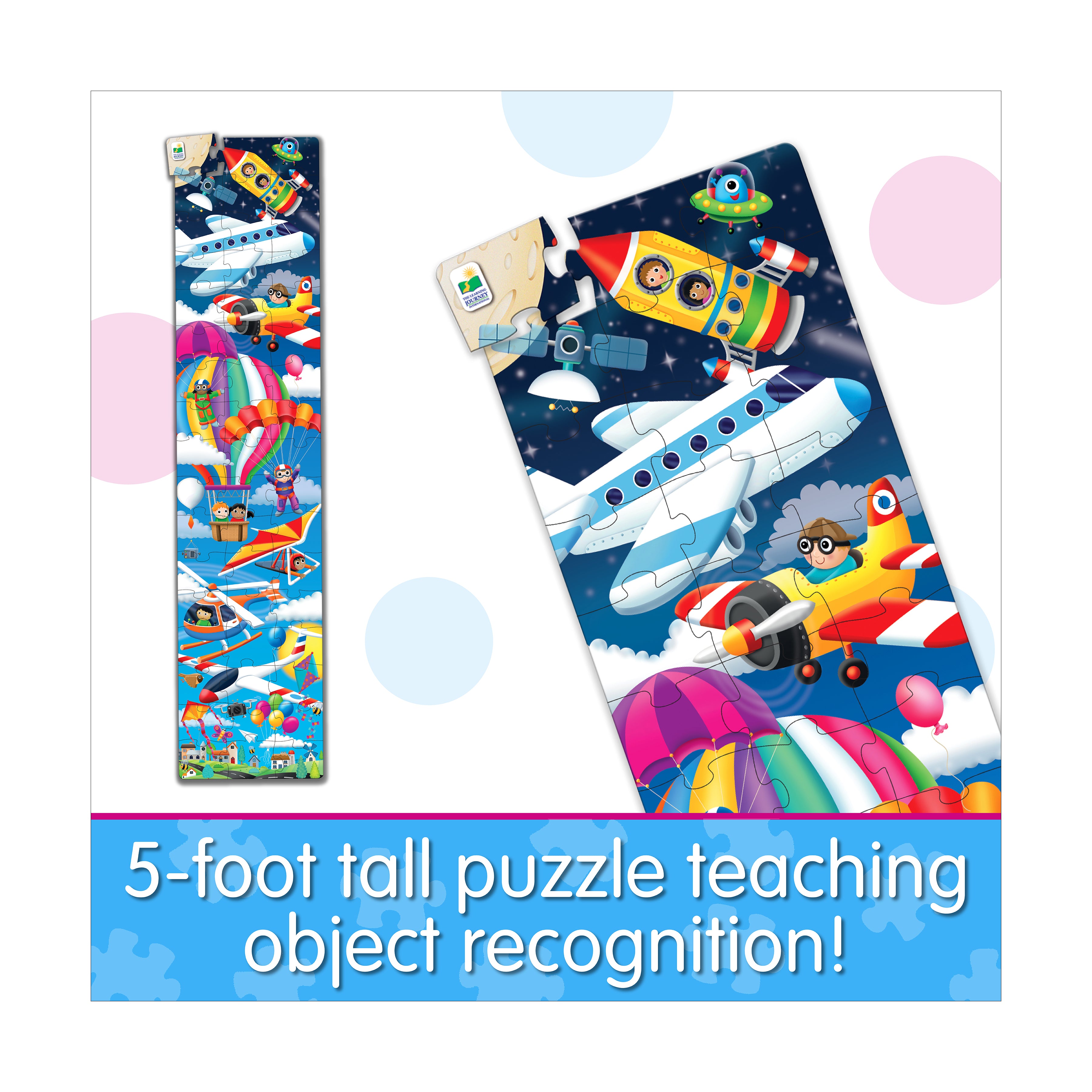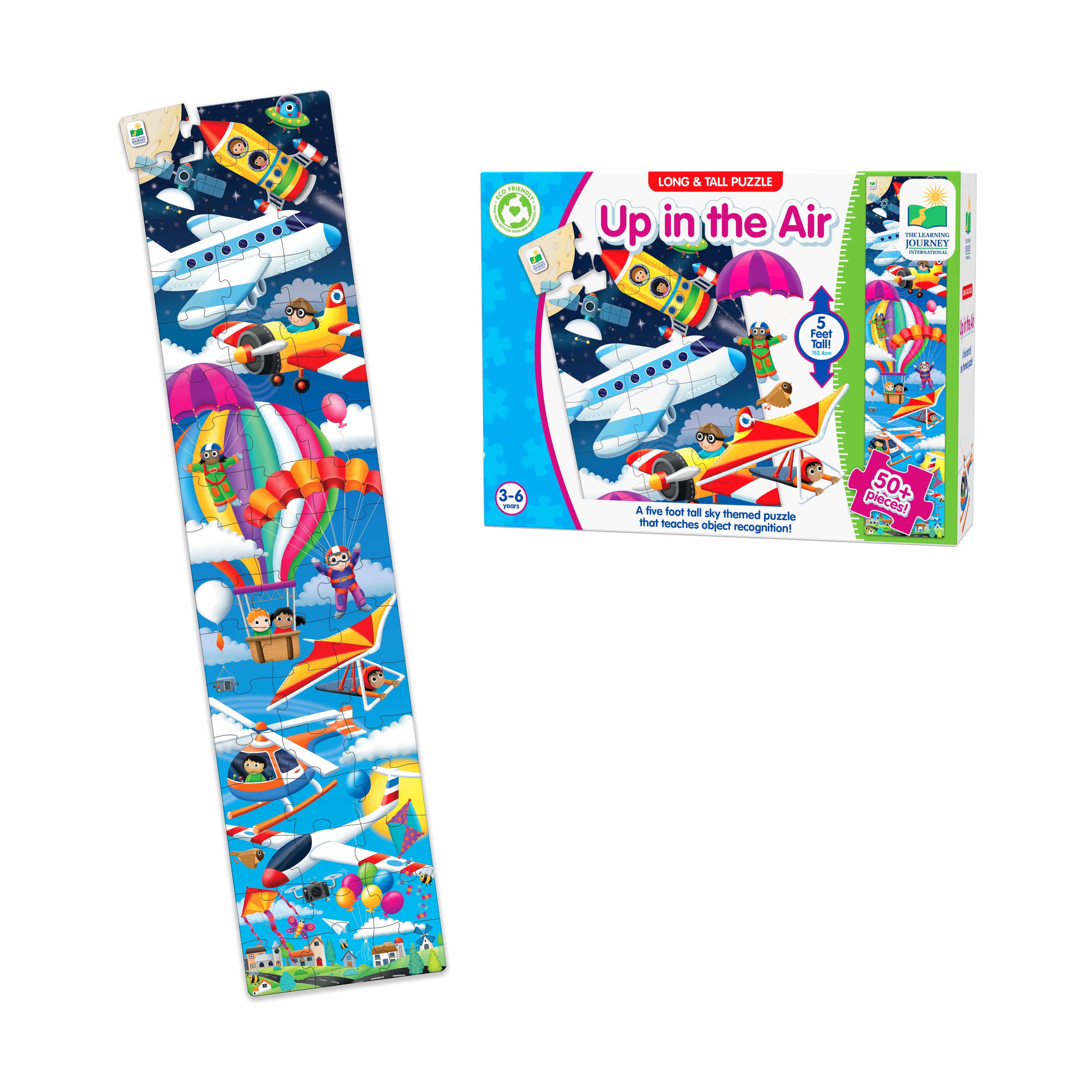 Soar to new heights of fun with the Sky-High Adventure Floor Puzzle – Up in the Air! Towering up to five feet tall, this jumbo 51-piece puzzle invites eager young aviators to explore the captivating world above us. Watch as your little ones piece together an array of fantastical flying machines, from zippy airplanes to soaring spacecrafts, igniting their imaginations and giving a boost to their motor skills with each oversized, easy-to-handle piece.