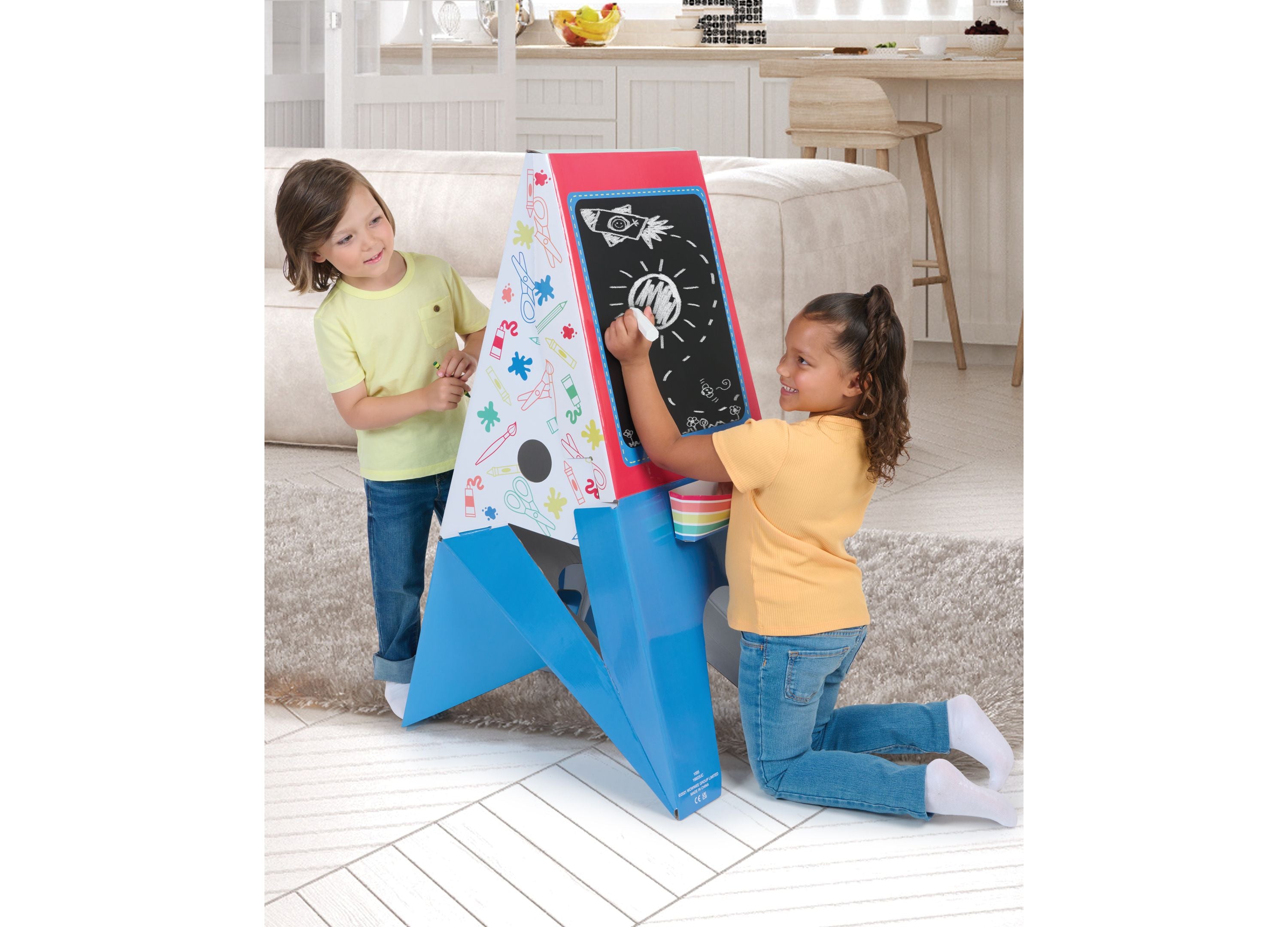 – Includes one chalkboard sticker, one whiteboard sticker, a roll of paper, and jumbo chalk.