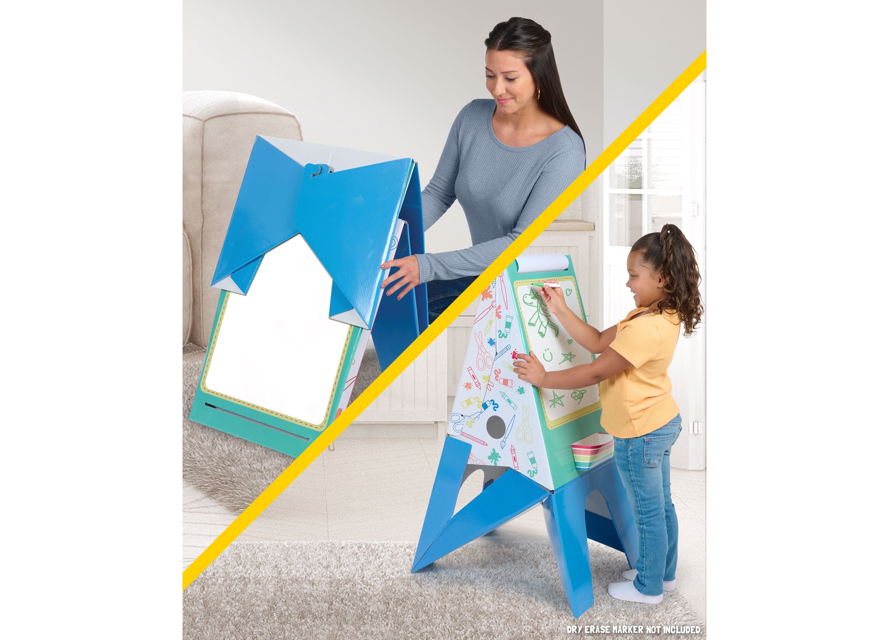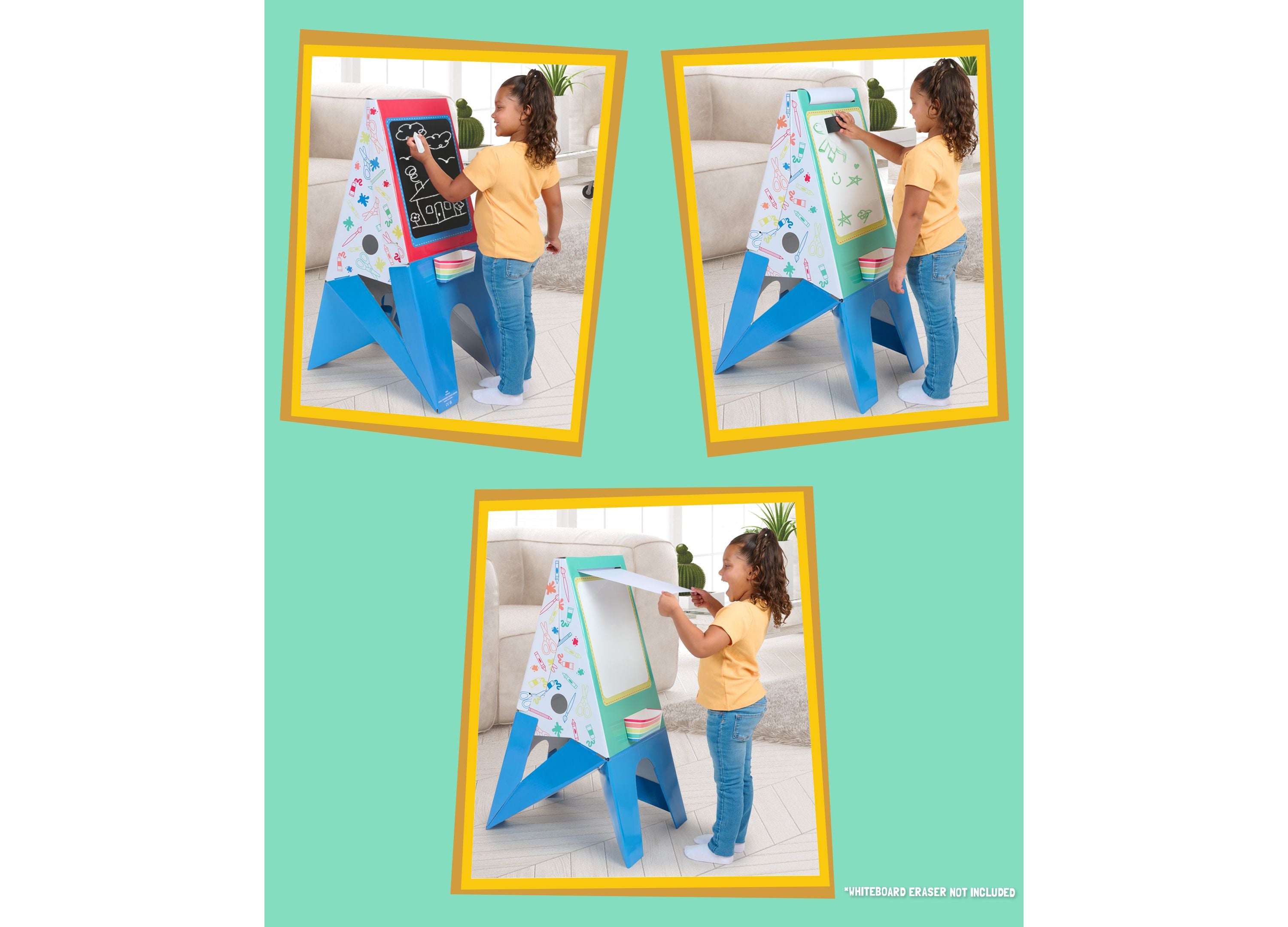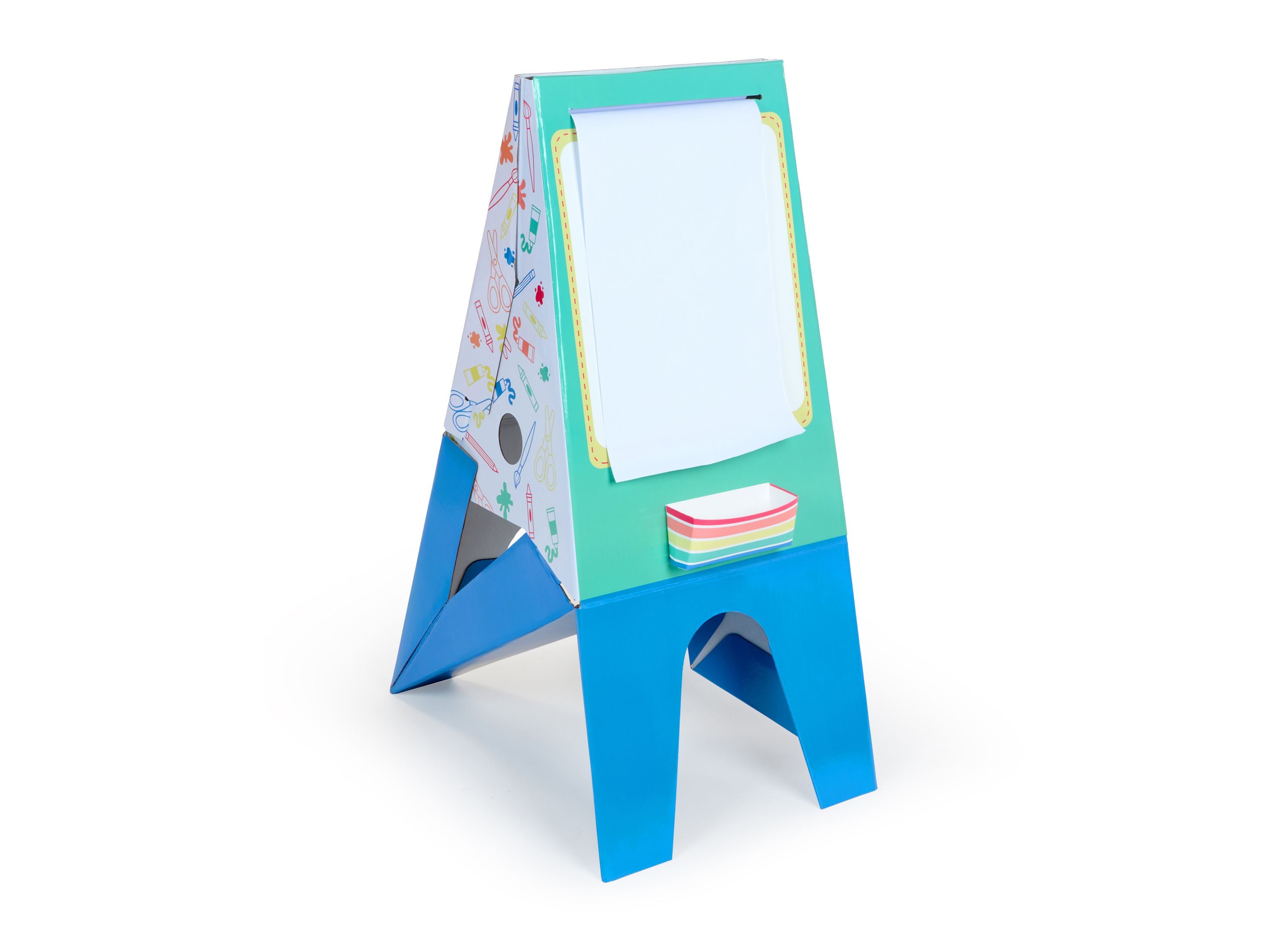 – A double-sided easel with a chalkboard on one side and a whiteboard on the other.